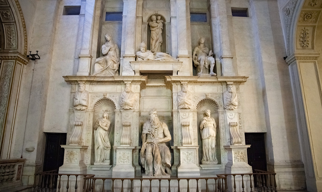 The Moses statue stands out as a masterpiece of Renaissance sculpture, showcasing Michelangelo’s unparalleled skill in rendering human emotion and physicality. The statue’s commanding presence and intricate details make it a focal point of the basilica and a testament to Michelangelo’s genius.