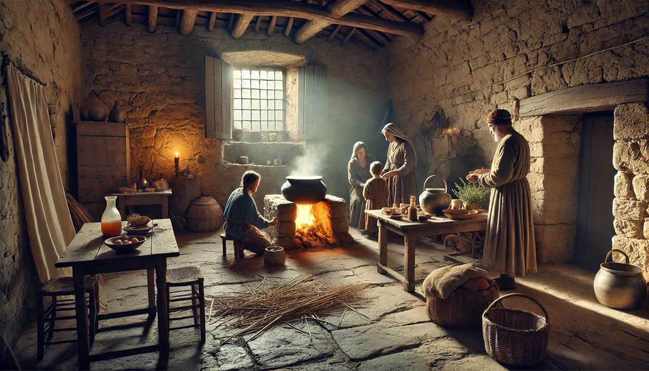 For the villagers, this is the cue to rise. They wake from their beds, which are often simple straw mattresses laid on wooden frames. The wealthy may have feather-filled mattresses and linen sheets, but most villagers sleep on straw or wool-stuffed sacks. In the dim light, families gather around the hearth, which has been kept smoldering throughout the night.